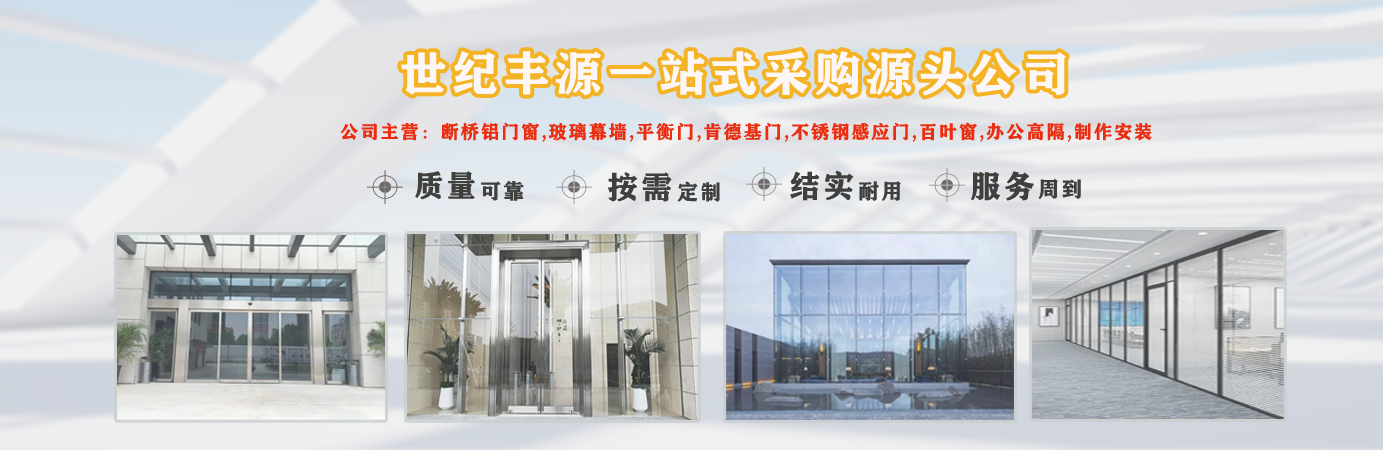 天津世紀豐源門窗有限公司從事斷橋鋁門窗,玻璃幕墻,平衡門,肯德基門,不銹鋼感應門,百葉窗,辦公高隔,制作安裝一站式訂制生產及配套服務等。  公司自成立以來,始終堅持以人才為本、誠信立業的經營原則,薈萃業界精英,成熟的技術、管理方法及企業經驗與國內企業的具體實際相結合,為企業供給各個方面的解決方案,使企業在激烈的市場競爭中始終堅持競爭力,實現企業快速、穩定地發展?! ≠|量好、服務好、才能信譽好,公司已在諸多領域取得輝煌成績,愿意成為您可信賴的長期合作伙伴。  讓我們攜手同行,共同實現“讓普通老百姓都用得上高端門窗”...